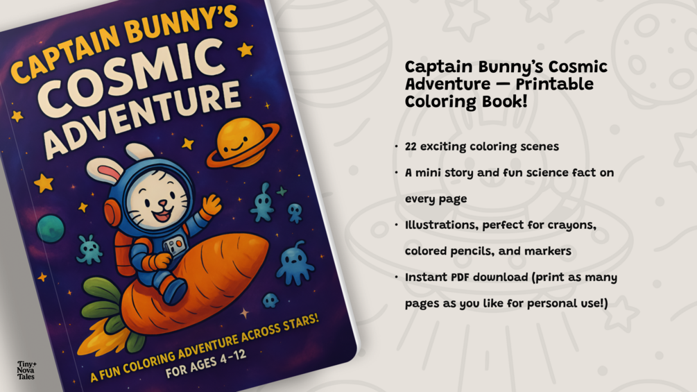 Captain Bunny’s Cosmic Adventure is a playful 8.5" × 11" printable coloring book for curious kids ages 4–12.